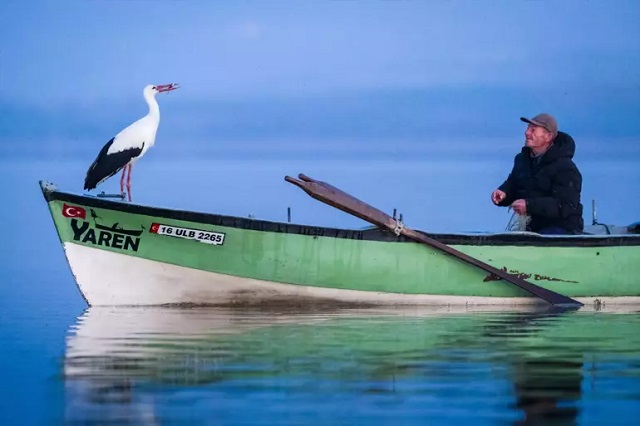 Bursa'nın Karacabey ilçesinde, Uluabat Gölü'nün kıyısındaki kırsal Eskikaraağaç Mahallesi'nin simgesi "Yaren" leylek, 14'üncü yılda da gelerek balıkçı Adem Yılmaz'ın kayığına bu sabah kondu. Adem Yılmaz'la kurduğu "dostluk hikayesi" ile tanınan Yaren, göç mevsiminde Avrupa Leylek Köyleri Birliği üyesi Eskikaraağaç'a bu yıl geç ulaştı. Yaren leyleğin, göl manzaralı yuvasının bulunduğu mahallede balıkçı Yılmaz'ın kayığındaki "geleneksel" pozu, doğa ve yaban hayatı fotoğrafçısı Alper Tüydeş tarafından kayda alındı. Nihayet beklenen kavuşma gerçekleşti. Yaren Leylek 14. yılında da varım dedi. Dün göçten gelip önce yuvasına konup eşiyle özlem giderdi ve bu sabahta soluğu Adem Amca'nın kayığında aldı. Adem Amca ise onu böyle ayakta karşıladı.