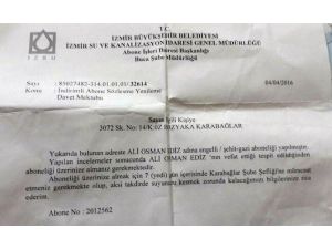 İzmir'de yaşayan Ali Osman Ediz, İzmir Büyükşehir Belediyesi Su ve Kanalizasyon İdaresi Genel Müdürlüğü (İZSU) gelen mektup şoke oldu. Mektubu eline alan Ediz, "Yapılan incelemeler sonucunda Ali Osman Ediz'in (56) vefat ettiği tespit edildiğinden aboneliği üzerinize almanız gerekmektedir. Aboneliği üzerinize almak için 7 gün içerisinde Karabağlar Şube Şefliğine müracaat etmeniz gerekmekte olup, aksi takdirde suyunuzu kesmek zorunda kalacağımızı bilgilerinize rica ederim" satırlarını okuyunca hayretler içerisinde kaldı.