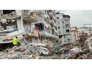 Kahramanmaraş merkezli depremlerin ciddi hasara neden olduğu Gaziantep'in Nurdağı ilçesinde ağır hasarlı binalarda yıkım çalışması yapan ekipler binada asılı bulunan Türk bayrağını hassasiyetle indirdi.