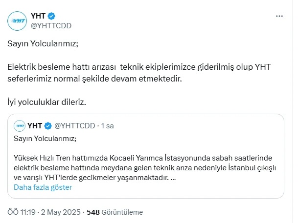 Yapılan ikinci açıklamada "Sayın Yolcularımız; Elektrik besleme hattı arızası teknik ekiplerimizce giderilmiş olup YHT seferlerimiz normal şekilde devam etmektedir. İyi yolculuklar dileriz" denildi.